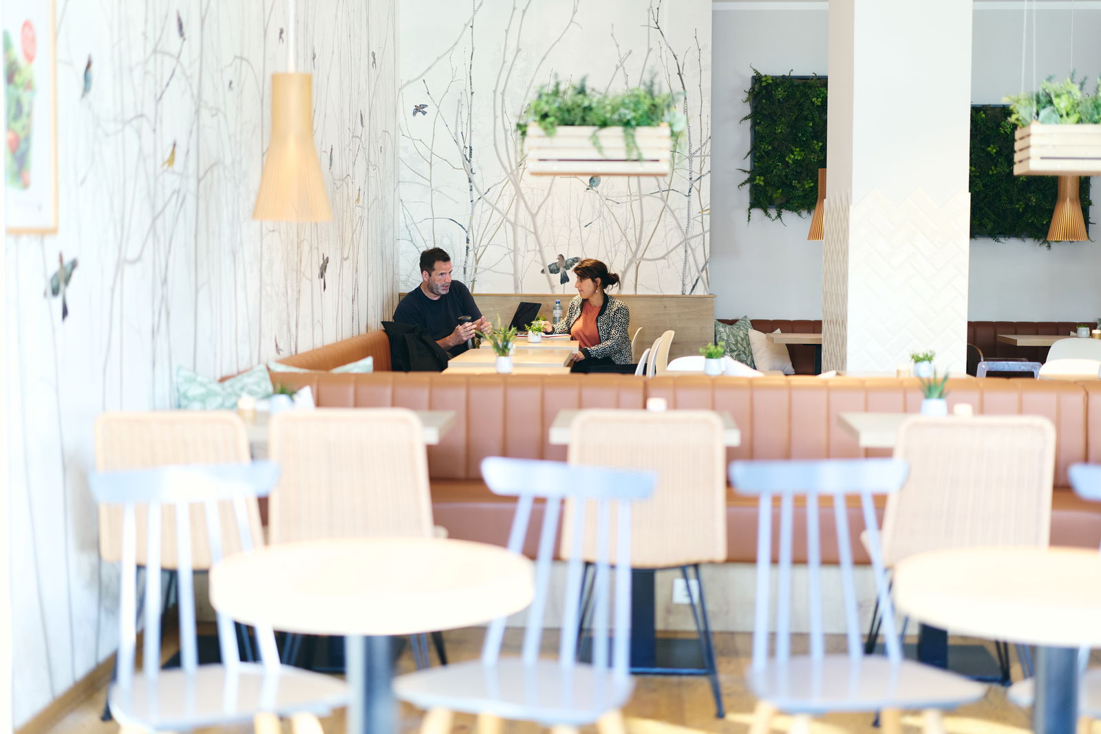 Wir setzen uns an einen der kleinen rechteckigen Tische. Noch ist es ruhig. In der Küche schneiden Mitarbeitende Gemüse, hinter dem Tresen werden Boxen gestapelt, Muffins aufgefüllt und die Kaffeemaschine angeheizt. Ein paar letzte Handgriffe, bevor um 11:30 Uhr Studierende und Angestellte aus der Nachbarschaft für ein gesundes Mittagessen oder einen Coffee to go hereinströmen. Aber auch bei Touristinnen und Touristen ist das dean&david beliebte Anlaufstelle.